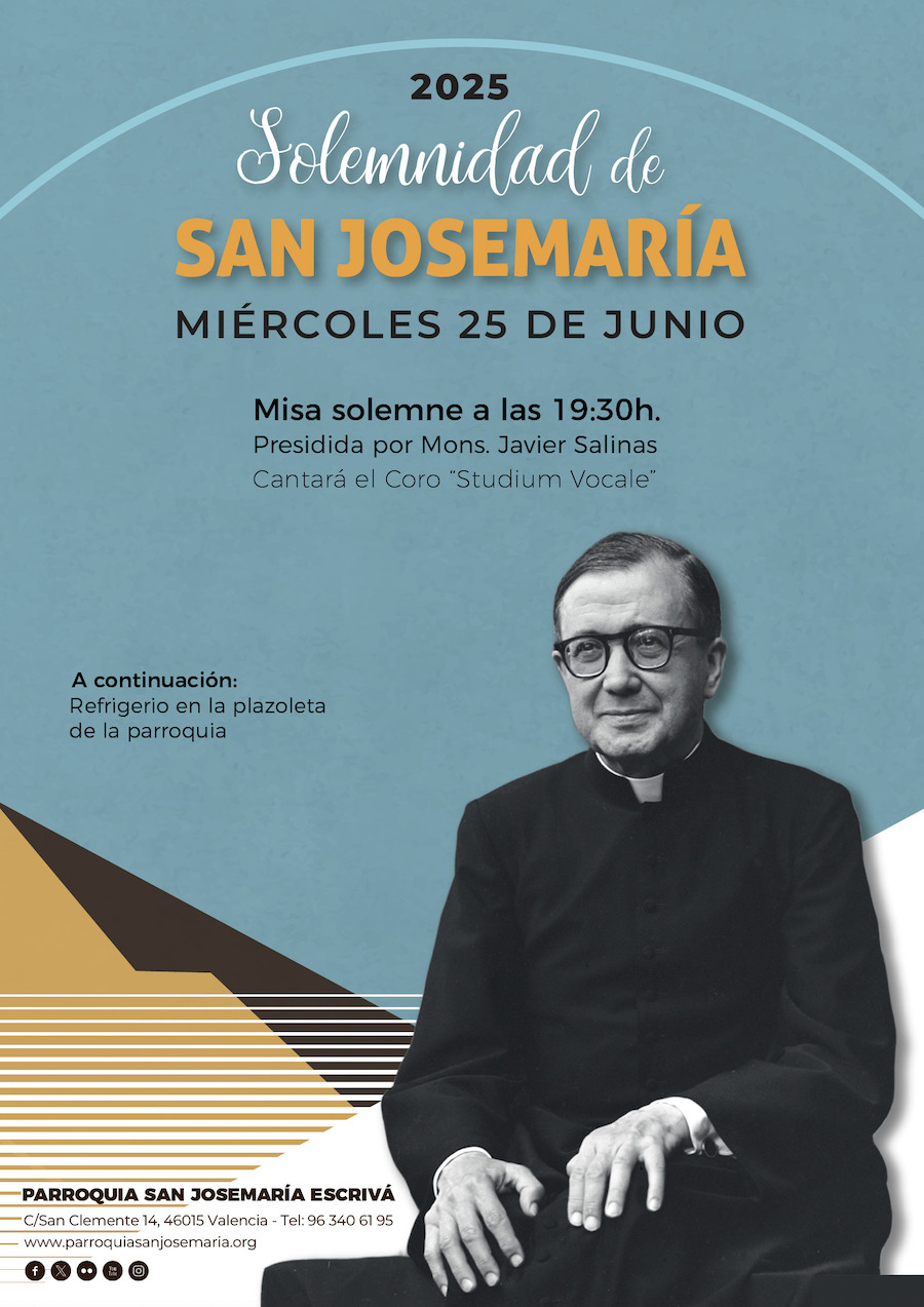 El miércoles 25 de junio celebraremos la SOLEMNIDAD DE SAN JOSEMARÍA, titular de nuestra Parroquia, con una Misa solemne a las 19:30h presidida por Mons. Javier Salinas, obispo auxiliar emérito de Valencia y cantará el Coro Studium Vocale.